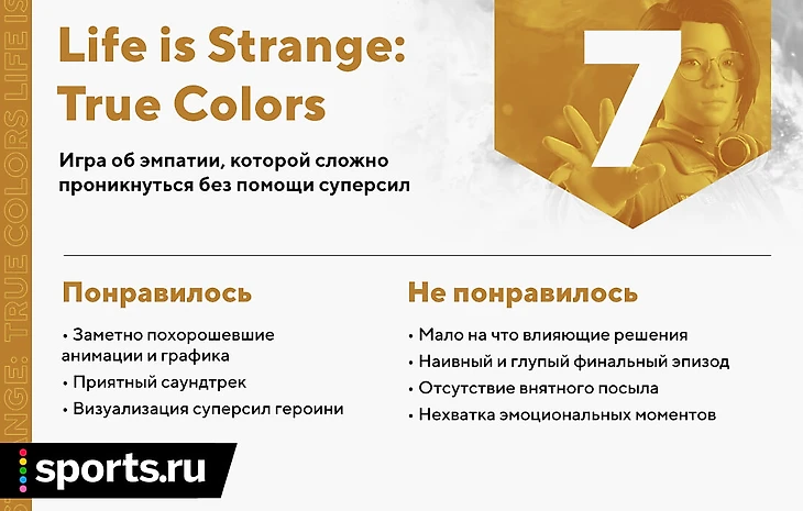 Life is Strange: True Colors – третья самостоятельная история в уже известной серии – выходит спустя шесть лет после оригинала и конкурирует в первую очередь с той же историей Максин и Хлои. Хотя у True Colors сильно изменился движок и ее сделала совершенно другая студия, разработчики во всем воспроизвели формулу серии. Снова в главной роли молодая девушка (хоть и несколько старше Максин), обладающая суперсилой и ввязывающаяся в опасную историю. Снова маленький американский городок, населенный преимущественно молодежью. Снова саундтрек почти целиком состоит из душевных инди-треков.
