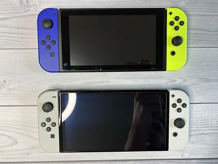 В основном это, разумеется, заслуга нового экрана. Вместо 6,2-дюймовой LCD панели в новой консоли установлен OLED-дисплей диагональю 7 дюймов. Разрешение при этом осталось прежним – те же 720p, – но разница все равно колоссальна. Во-первых, размер самого Switch остался практически таким же (было 239 х 102 х 13.9 мм и 398 грамм, стало 242 x 102 x 13,9 мм и 420 грамм), увеличенный экран вписали за счет значительного уменьшения рамок. Во-вторых, в выключенном состоянии новый дисплей практически сливается с рамками – уже из-за этого новая консоль выглядит значительно дороже.