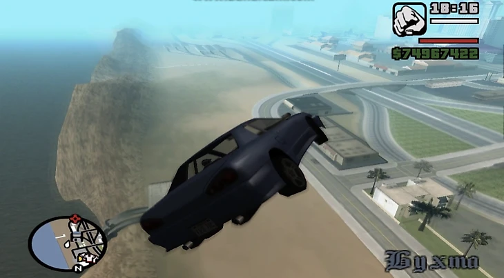 Мое второе развлечение было более цивильным и изобретательным. Для него требовалось всего два чит-кода: COXEFGU на добавление нитроускорителей всем автомобилям и RIPAZHA, чтобы машины летали. После этого я выбирал любое авто на дороге, запрыгивал на капот, садился на корточки и один раз выстреливал – так, чтобы не попасть в водителя. Бедолага после этого, естественно, паниковал и жал педаль в пол, заодно включая нитро – через несколько секунд машина взлетала. Я же оставался на капоте и старался удержаться на нем как можно дольше, пока Си-Джея не снесет ветром. Однажды я даже прошел импровизированный челлендж до конца: автомобиль, водитель и я благополучно пролетели над городом и приземлились в океан. Все выжили.