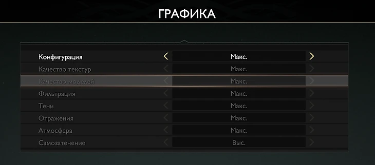 Настройки графики не слишком детальные, но в целом гибкие: можно настроить 7 основных параметров от разрешения текстур до самозатенения. При этом качество отражений «Макс.+» доступно только в ручной конфигурации, как и самые низкие настройки.
