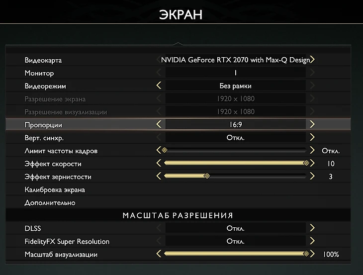 На совместимых видеокартах доступен DLSS (апскейл разрешения с минимальной потерей качества) c 4 пресетами: «Макс. производительность», «Производительность», «Баланс» и «Качество». При этом в настройках видно, какое разрешение используется для рендеринга для каждого из вариантов – при игре в 1080p оно варьируется от 360p до 720p. Также есть «красный» аналог AMD FidelityFX Super Resolution.
