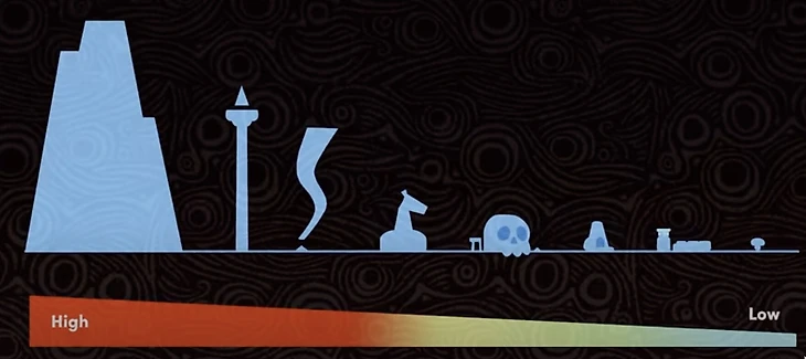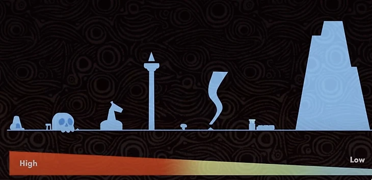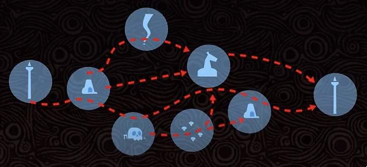 • Наконец, чтобы не перегружать игрока количеством точек интереса, дизайн всего мира построили по правилу треугольников. Если присмотреться, все точки интереса в Breath of the Wild и Tears of the Kingdom так или иначе имеют треугольный силуэт – будь то горы, холмы или святилища. Таким образом, во-первых, игрок получает естественный выбор: на гору можно забраться, либо обойти ее слева или справа. Во-вторых, треугольники всегда блокируют часть стоящих за ними объектов: например, по пути к башне у вас на горизонте появятся еще несколько привлекательных точек интереса.