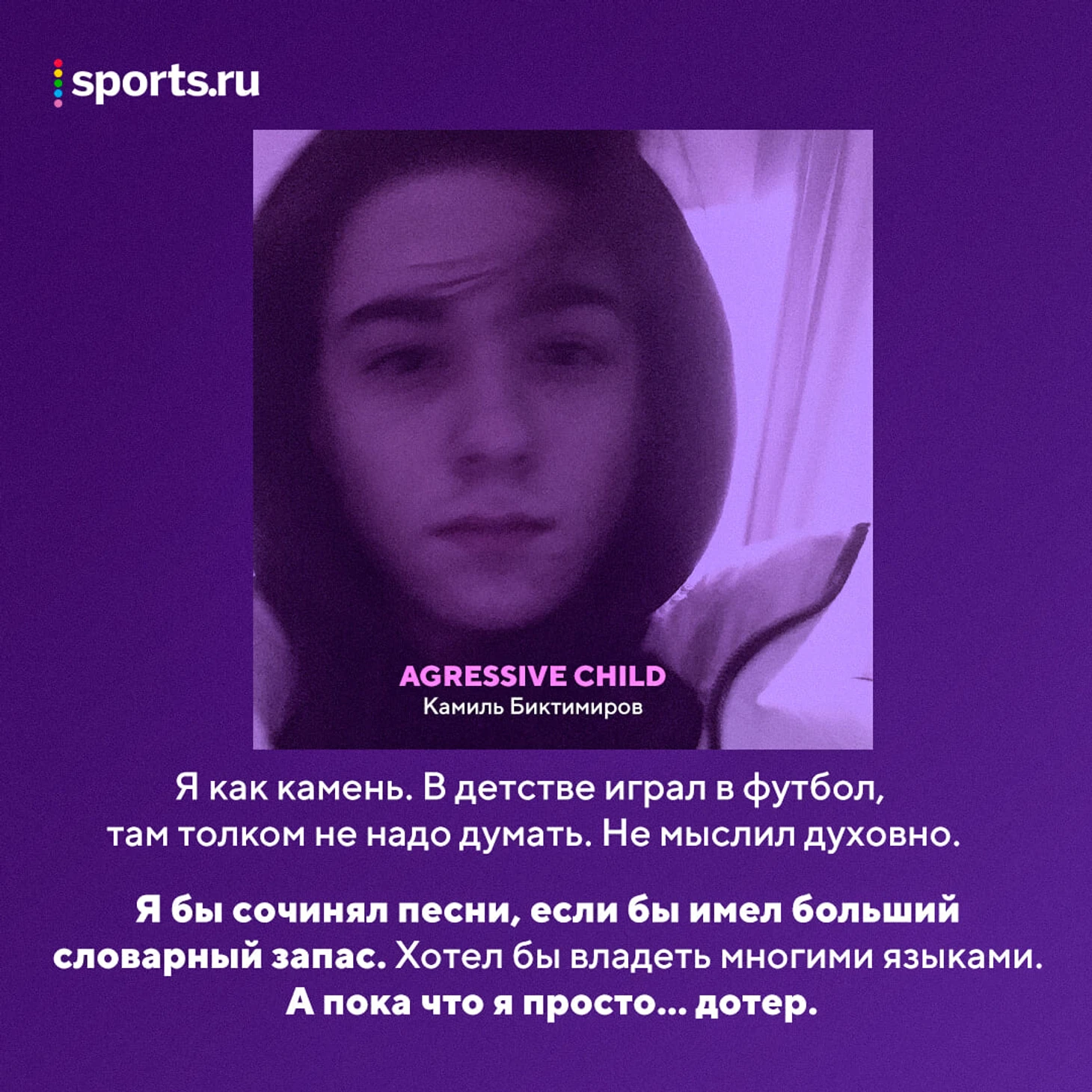 agressive child: Если бы у меня не было проблем со словарным запасом… Если бы раньше в детстве я был более таким гибким в этом плане, может я сочинял бы какие-то песни. А так я вообще… как камень.