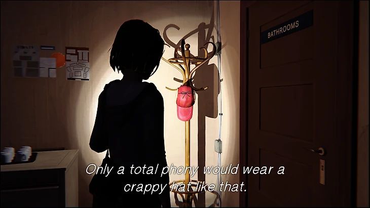 В третьей главе Максин и Хлоя проникают в кабинет директора для того, чтобы получить столь важную для них информацию. Перед тем как это сделать, мы оказываемся в офисе секретарши. В самом углу помещения можно заметить красную охотничью шапку. Если мы попробуем осмотреть ее, то Макс скажет что-то вроде: «Только дутая пустышка будет носить дерьмовую шапку вроде этой» (перевод вольный).