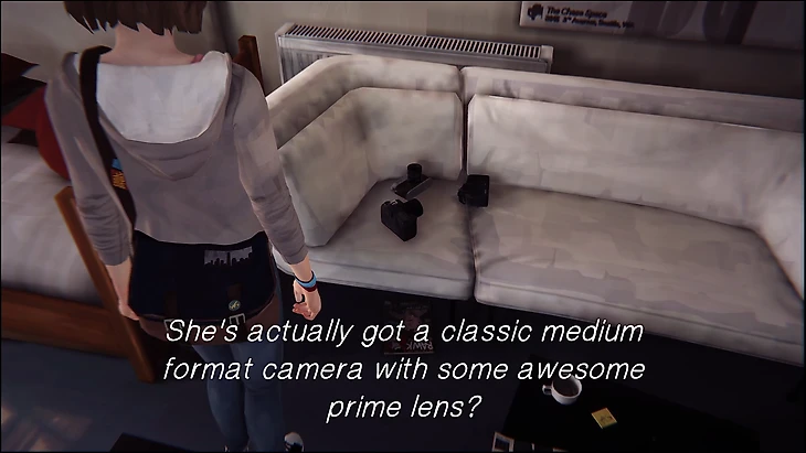 Перейдем к более конкретным примерам. Когда мы впервые оказываемся в комнате Виктории, Макс видит на кровати дорогой фотоаппарат и начинает еще больше гневаться на одноклассницу.