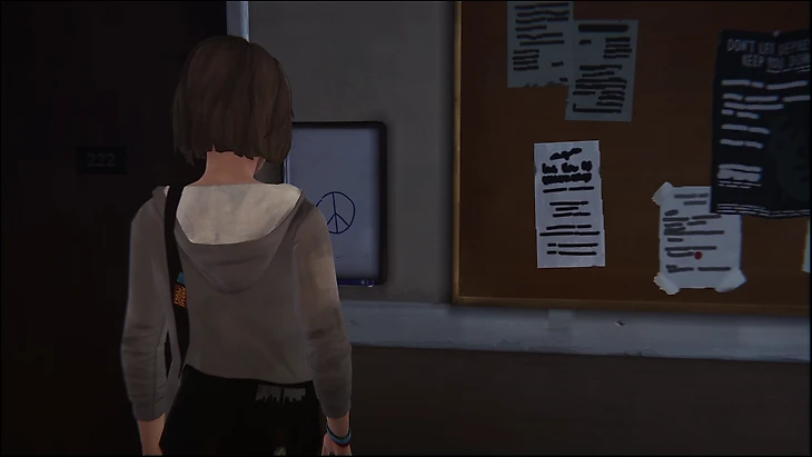Теперь рассмотрим пару эпизодов в игре. В первой главе, когда мы попадаем в общежитие, мы можем стереть издевательские надписи с дощечки Кейт и заменить рисунком символа мира. Очень добрый и правильный с моральной точки зрения поступок. Во второй главе надписи появятся вновь. Мы можем снова стереть похабные надписи, но нарисовать что-то свое игра нам уже не даст. Вот такая вот случайная параллель.