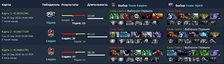 Первыми вступили в бой Team Spirit и Team Empire. Стоит отметить, что обе команды до этого показали себя не лучшим образом – если первые остановились в шаге от путёвки на Мейджор, то «имперцы» вовсе не прошли две открытые квалификации. Таким образом, Майнор может стать доказательством того, что те отборы были лишь недоразумением.