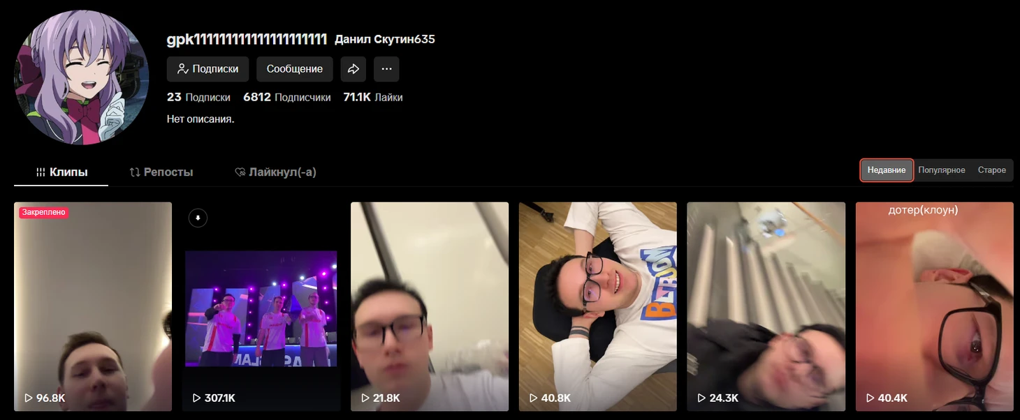 А 21 ноября Данил выложил первое видео в свой аккаунт TikTok. На момент написания этого текста у него уже почти 7 тысяч подписчиков, 71 тысяча лайков, а просмотров – около миллиона! Юзернейм Скутина – gpk111111111111111111111 (это 21 единица). Или Данил Скутин635 – так тоже можно найти аккаунт.