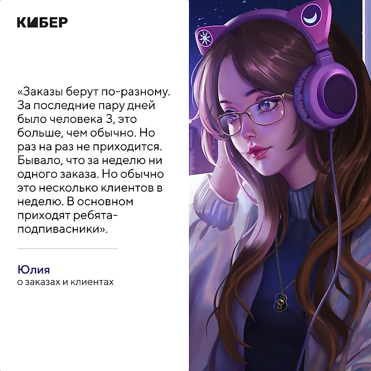 «Заказы берут по-разному. За последние пару дней было человека 3, это больше, чем обычно. Но раз на раз не приходится. Бывало, что за неделю ни одного заказа. Но обычно это несколько клиентов в неделю. В основном приходят ребята-подпивасники, и мы играем турбо. Но лучше бы я играла ранкед. Турбо вообще неинтересный режим».