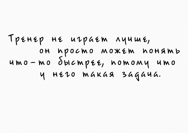 Получается так, что тренер не играет лучше, он просто может понять что-то быстрее, потому что у него такая задача. А говоря про ЧСВ, если ты уже в команде с человеком, и из-за ЧСВ не готов ему довериться, то почему вы, собственно, вместе работаете? Значит, ты должен об этом сказать, и это априори конфронтация.