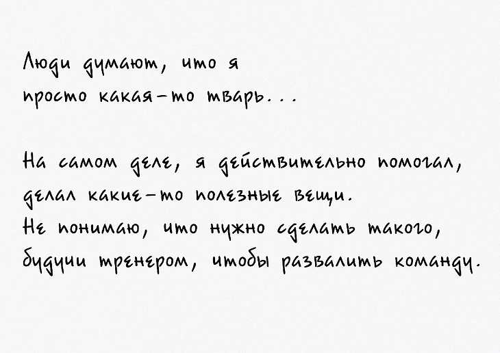 По поводу того, что люди говорят, что состав развалил я. Не понимаю, что нужно сделать такого, будучи тренером, чтобы развалить команду. Люди думают, что я просто какая-то тварь, несу какую-то фигню. На самом деле я действительно помогал, делал какие-то полезные вещи. Как я мог это развалить – непонятно. Я не интриган, который такой: «Этого кикнуть, того кикнуть»!