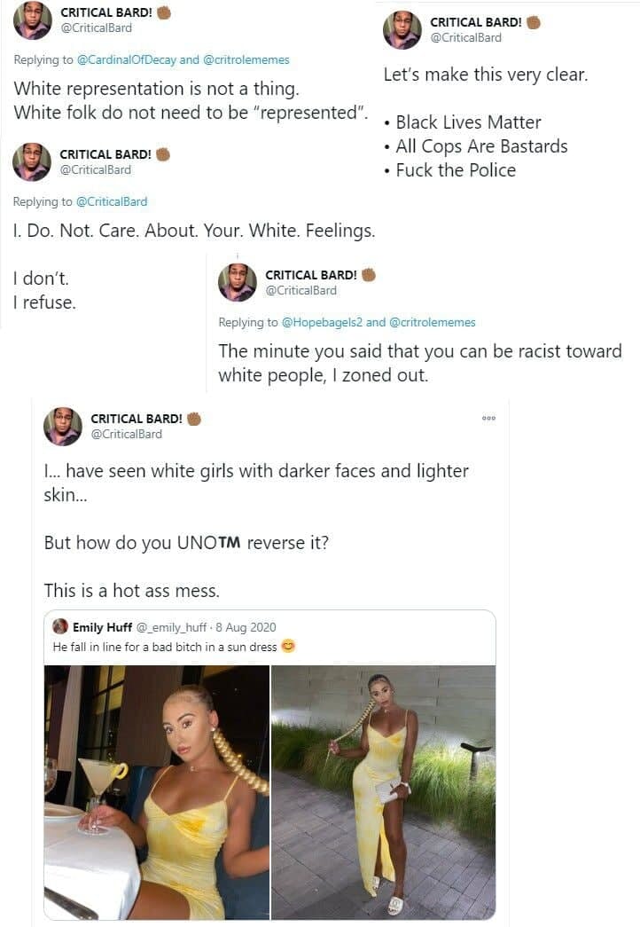 «Я вижу это в твиттере и здесь. Кто-то опубликовал подборку всех моих твитов, в которых я говорил, что меня не волнуют чувства белых. И теперь он использует это против меня, заявляя: «Я думал, что PogChamp теперь – это люди, которые не говорят плохие вещи». Это не одно и то же. Я не осуждаю... целый народ и не защищаю мятежников. Я говорю, что когда вы говорите «жизни белых важны», это не так. И я повторю вне зависимости от того, партнер ли я Twitch или нет. Жизни белых не важны, потому что жизней белых не существует».