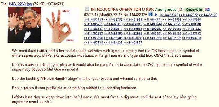 «Мы обязаны флудить и спамить в твиттере и других социальных сетях о том, что жест OK – символ превосходства белых. Создавайте фейки, пишите от имени белых девушек что-то вроде «OMG, это правдаааа».