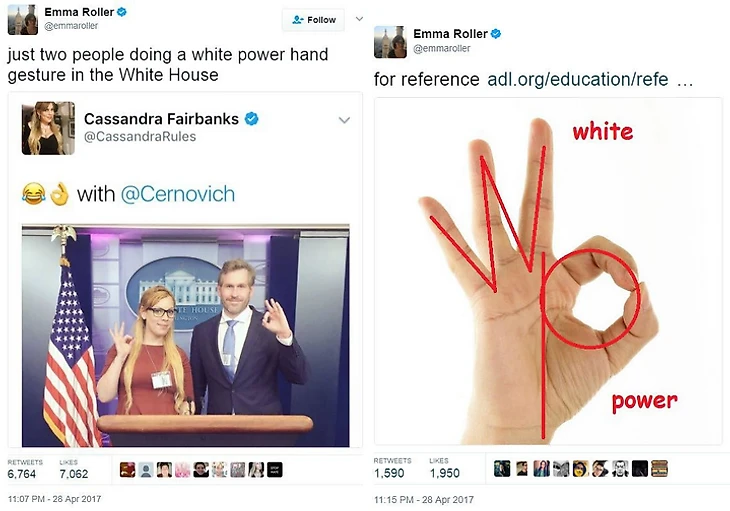 Все пошло по плану троллей: репортер телеканала Fusion Эмма Роллер ретвитнула фотографию журналистки Кассандры Фэрбенкс и Майка Серновича с подписью «просто два человека в Белом доме, показывающие жест превосходства белых». В качестве подтверждения своих слов она использовала ту самую картинку с форума.