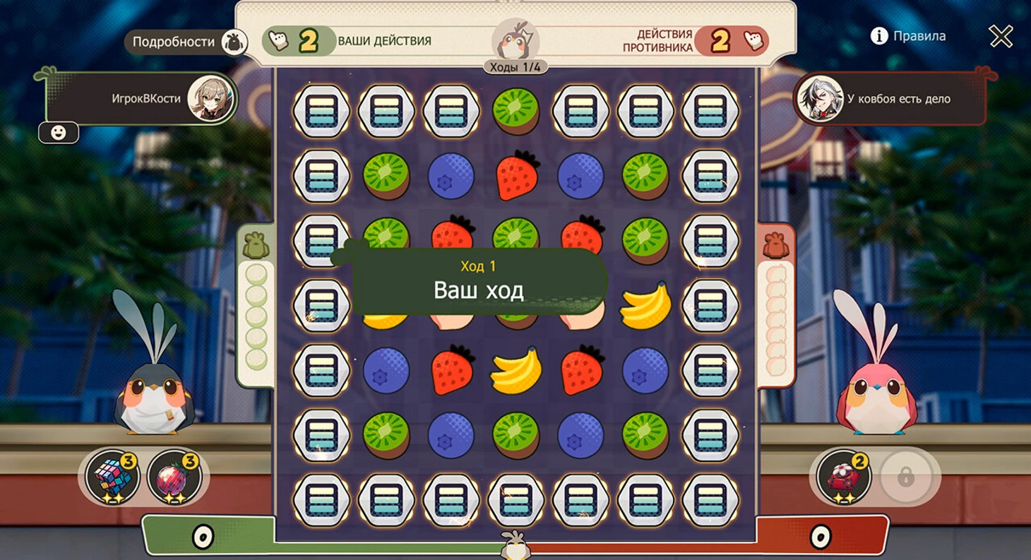 На поле появляется фиолетовая клетка – зона усиления, в которой уничтожение фруктов дает больше очков. А линейные и квадратные бомбы улучшаются до супербомб в начале хода, поэтому старайтесь не оставлять их сопернику.