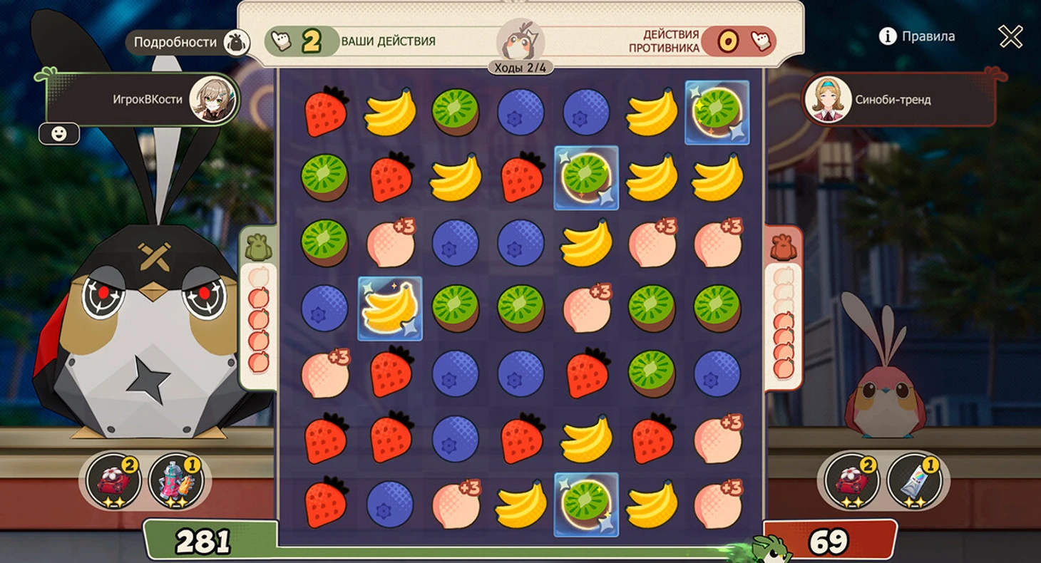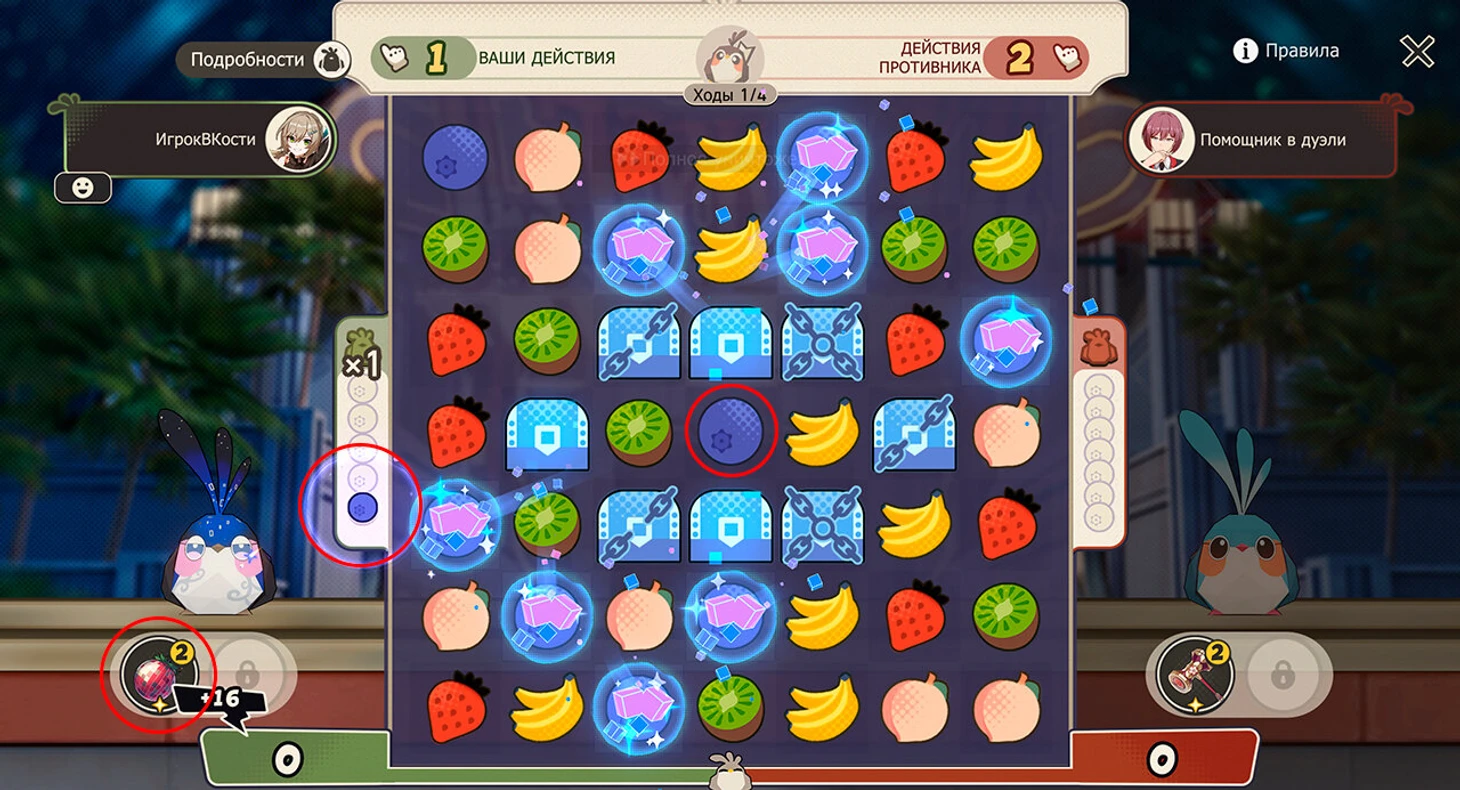 В обучающем бою игра сделает почти все за вас – необходимо только нажимать на выделенные клетки. В этом сражении нужно взять Яшмушку или Первопролетца и взрывать в первую очередь те фрукты и ягоды, которые отмечены слева от поля. Для Яшмушки это черника, для Первопролетца – киви.