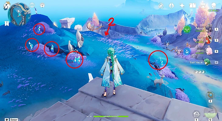 Перед началом фарма возьмите в отряд бесплатную Айно – она отмечает диковинки на мини-карте. Такими же способностями обладают Лаума и Флинс. Соберите один инеевый цветок, зайдите в инвентарь и нажмите на него. В описании справа выберите «Области сбора» для облегчения фарма. Не забудьте съесть что-нибудь для пониженного расходования выносливости, а также добавить в отряд двух Анемо героев для ускорения передвижения.