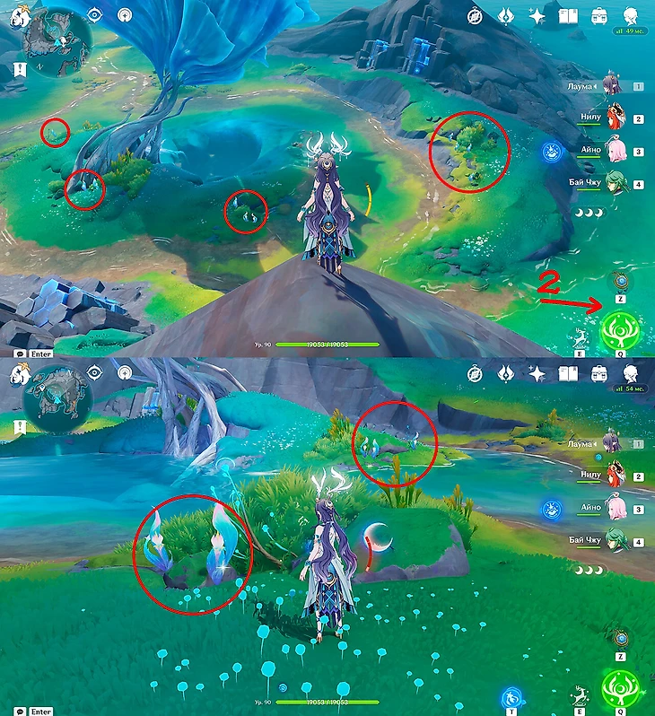 Здесь пригодятся Айно или Лаума в отряде, а также отметки точек сбора, чтобы ничего не пропустить. Еще три цветка находятся в правом нижнем углу, примерно где у Лаумы ульта, прямо у лестницы наверх.