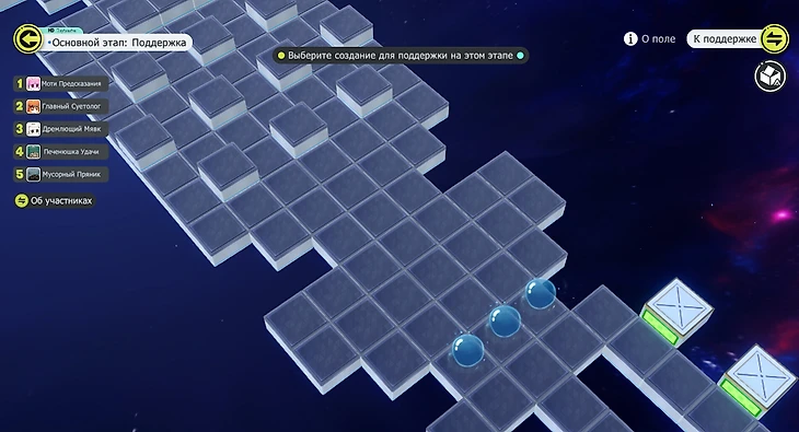 На поле много скользящих платформ, на которые может запрыгнуть Главный суетолог, а также есть препятствия в виде пузырей. Игра предлагает Дремлющего мявка, но на него поставят все, поэтому можно выбрать Суетолога или Моти предсказания. Выберите эффект поля «Разворот вихря» и не забывайте спамить препятствиями для других персонажей.