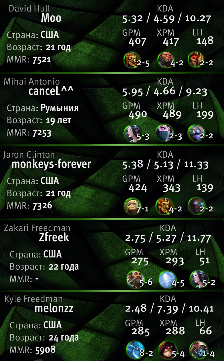Изменения в составе CompLexity серьезно ударят по их работоспособности. Причина проста: Monkeys-Forever – не керри, да и не был им никогда. Джарон предпочитает играть или в сложной линии, или на миде, на крайний случай. Это потянуло за собой еще одно изменение – Дэвид «Moo» Халл теперь занял позицию керри. Только и у него нет опыта в этой роли. В итоге после изменения у CompLexity есть два хардлайнера (даже три, если считать Кайла), полтора мидера и ни одного полноценного фармилы.