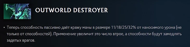 Из версии 6.86c. Воровство интеллекта убрали с Астрала, но добавили Орбе и сделали 0/1/2/3 на 40 секунд. Из игры ОД совершенно пропал. Но Айсфрог реанимировал его каждый последующий буквенный патч: в 6.86b воровство интеллекта подняли до 1/2/3/4, а в 6.86с накинули еще единичку интеллекта на каждом уровне: до 2/3/4/5. А еще и увеличили длительность действия на 25%.