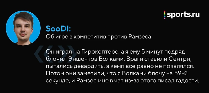 – Могу вспомнить историю с Рамзесом. Это было за несколько месяцев до его прихода в Team Spirit. Он играл тогда в своем стаке с местными новосибирскими или новокузнецкими пацанами. Тогда я уже выходил против него. Он играл на Гирокоптере, а я ему 5 минут подряд блочил Эншентов волками. Он не мог фармить их, просто потому что они не появлялись. Враги ставили Сентри, пытались девардить, а кемп все равно не появлялся. Потом они заметили, что я волками блочу на 59-й секунде, и Рамзес мне в чат из-за этого писал гадости.