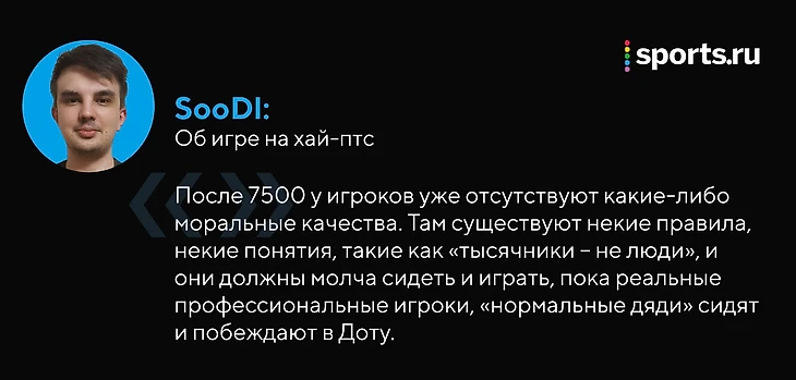 Я вернулся на свой смурф и играл там, апнул 7500 рейтинга. 7500 я бы назвал барьерным рейтингом для перехода в другую реальность. В ту реальность, где у игроков уже отсутствуют какие-либо моральные качества. Там Дота кардинально меняется, потому что нет ролевого рейтинга. Там существуют некие правила, некие понятия. Такие как «тысячники – не люди», и они типа должны молча сидеть и играть, пока реальные профессиональные игроки, «нормальные дяди» сидят и побеждают в Доту. Там игра становится отвратительной. Я заходил и не понимал, для чего там играю. Чтобы попасть в киберспорт? У меня давно нет такой цели. Играть рядом вместе с киберспортсменами? Это отвратительно, они ужасны и очень плохо относятся к людям, которые ниже их рейтинга, ниже их уровня. Они их просто ментально уничтожают, и, как правило, у игроков тысячного ранга нет мотивации что-то делать в игре.