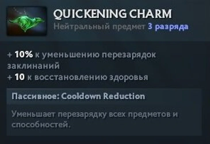 Уменьшение перезарядок всех способностей и предметов – читы. И Quickening Charm – легальный чит. 10% – очень много, если речь идет о перезарядке какого-то очень большого кулдауна, и наоборот. Например: