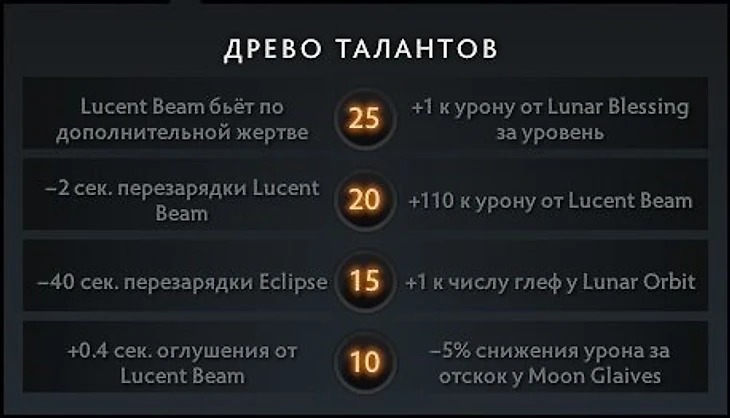 Сейчас ничего подобного не осталось, а таланты 15-го и 25-го уровней теперь доступны на 20-м в измененном виде. До недавнего патча 7.37е у Луны и вовсе были лучшие таланты в игре!