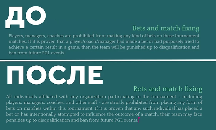 Однако примерно в 16 часов по московскому времени PGL в прямом эфире исправила рулбук: теперь там учтены «все люди, связанные с любой организацией, участвующей в турнире, включая игроков, менеджеров, тренеров и других сотрудников». То есть и главы Дота-направлений в том числе.