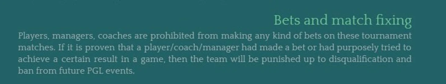 Подтверждения словам Йонда есть в регламенте PGL Wallachia S4 в разделе «Bets and match fixing»: «Игрокам, менеджерам и тренерам запрещено делать любые ставки на матчи этого турнира. Если будет доказано, что игрок, тренер или менеджер сделал ставку или намеренно пытался добиться определенного результата в матче, команда будет наказана вплоть до дисквалификации и бана на будущие турниры PGL».