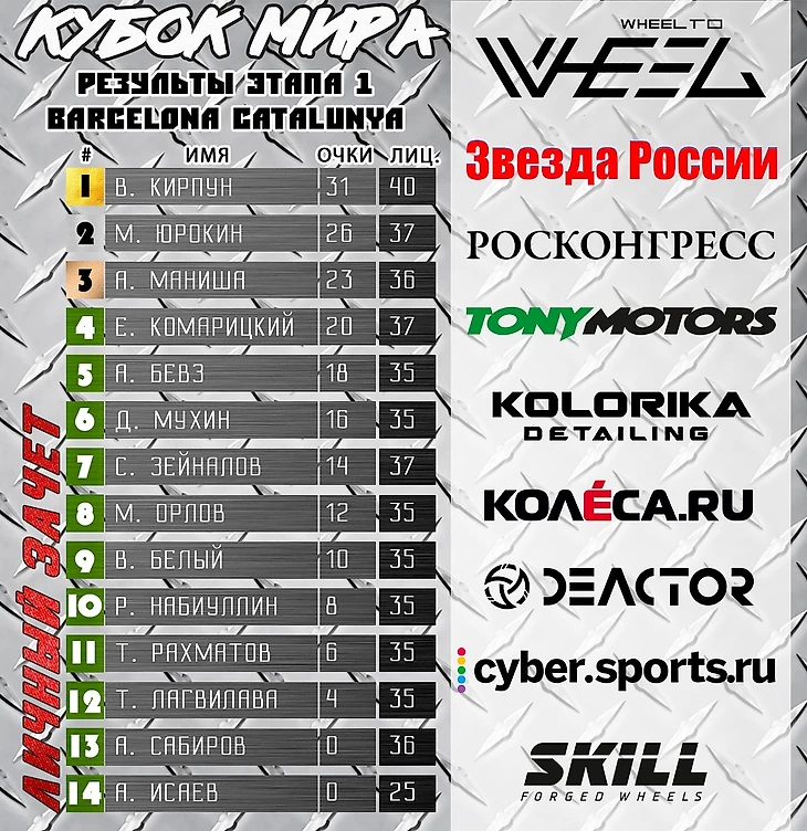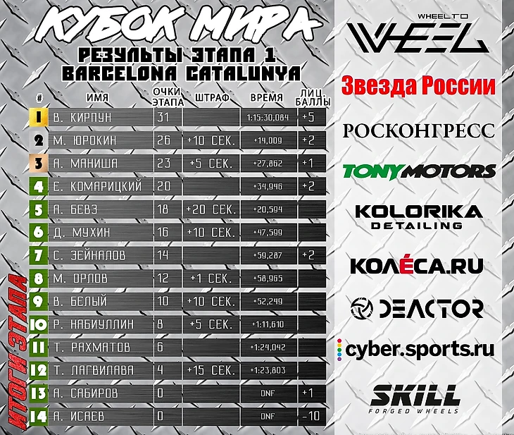 Как прошла гонка, вы можете посмотреть в записи на YouTube-канале чемпионата : youtube.com/c/WheeltoWheel Также, там представлен и Highlight с основными событиями в гонке. Ну а для тех, кто хочет узнать результаты прямо сейчас, могут заглянуть в таблицу с очками и штрафами, представленных на изображениях ниже.