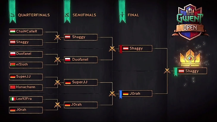 Турнир по Гвинту на Gamescom начался с неожиданных результатов. В четвертьфинале вылетели eiSloth и Lea92Fra – #1 и #3 рейтинга на момент отбора. Уверенно прошёл в полуфинал Shaggy – победитель дополнительного Wild Card отбора. SuperJJ продемонстрировал огромную колоду Фольтеста, порадовав стороннего зрителя и потрепав себе нервы. В остальном по колодам всё было стандартно: почти всегда забаненный оппонентом Дагон на погоде, Хенсельт на разведчиках из Кринфрида, Бран на сбросе, Нильфгаард на милле (ещё один популярный вариант для бана), а также редкая Эитне в двух вариантах (контроль с Ширру и стойкие краснолюды).