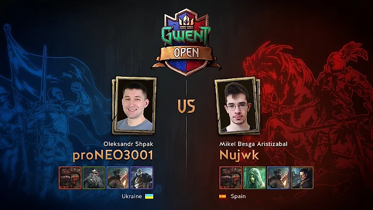 Во второй партии (Королева главоглазов против Эмгыра вар Эмрейса) уже в первом раунде ситуация для proNEO3001 кажется совсем не радужной (из-за Свирса соперника). Nujwk использует тактику алхимии, несмотря на лидера, и у него получается вести игру. Двойной Свирс во втором раунде кажется крайне устрашающим, но proNEO3001 хватает накера и он побеждает во втором раунде, сохранив лишнюю карту. В третьем раунде именно это играет ключевую роль. (2:0)