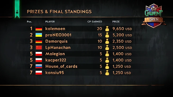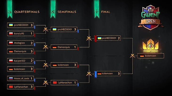 Бенджамин "kolemoen" Пфаннштиль из Германии становится триумфатором Gwent Open #6! Он был хорош на каждом этапе турнира, а в финальной игре проявил настоящую волю к победе, отыгравшись и ходя изначально первым. Кстати, kolemoen представлял не самую известную киберспортивную команду – Complexity Card Gaming, недавно пригласившую Бенджамина. Что ж, они попали в яблочко, kolemoen первоклассный игрок в Гвинт.