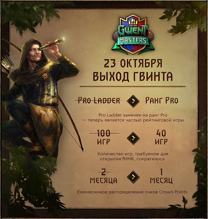 Мы запустили Pro Ladder, чтобы внести в соревнования разнообразие и поощрить регулярную смену фракций. Сразу после своего появления в 2017 году этот режим стал связующим звеном между сильнейшими любителями и профессионалами. Окончание очередного сезона Gwent Masters – это идеальный момент, чтобы внести изменения в систему Pro Ladder. При этом все нововведения предложили участники сообщества. Среди прочего, мы изменили количество матчей, которое необходимо выиграть, чтобы занять верхние строчки в рейтинге. Кроме того, мы решили проблему, из-за которой игроки, достигшие 21-го ранга, могли принять участие в Pro Ladder только спустя месяц после своего официального допуска.