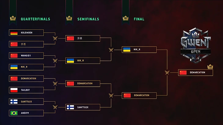 В четвертой партии игроки взяли колоды скоя'таэлей и Скеллиге. Demarcation реализовал свою стратегию в полной мере и с каждым ходом в третьем раунде становилось понятнее, что это последняя партия на турнире. Огромный разрыв по очкам фиксирует победу китайца на Open! (3:1)