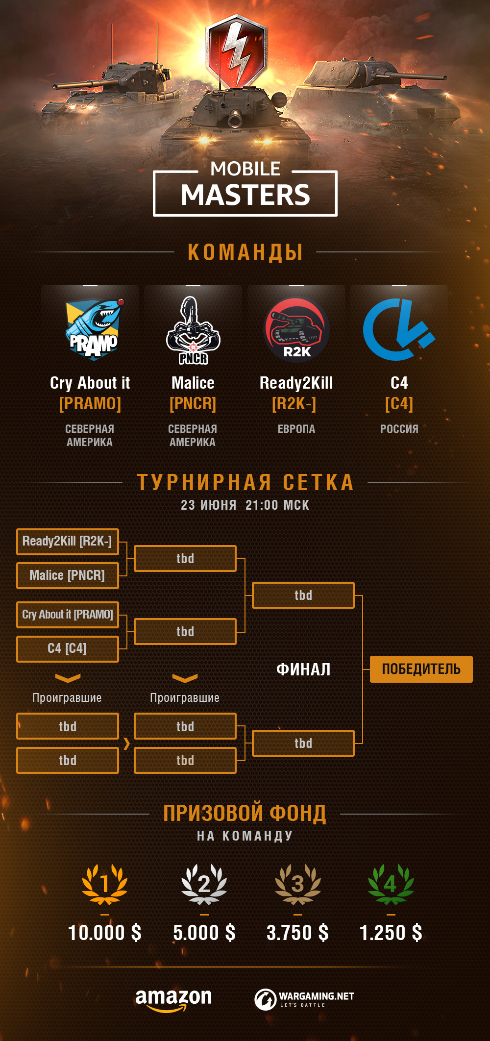 23 июня в Сиэтле прошел топ-турнир Mobile Masters. Организатором турнира стала компания Amazon.Турнир проходил по системе Double Elimination, бои до трех побед на танках 10-го уровня. Победитель получил 10 тысяч долларов.