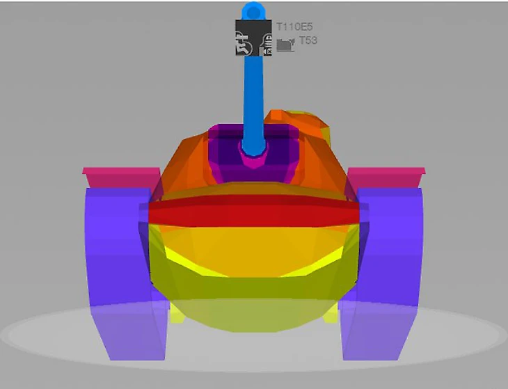Если E 100 стоит перпендикулярно бортом, то пробить нижнюю часть экрана не составит труда. Верхнюю же часть снаряд не пробьет, так как экран расположен под углом. Когда E 100 стоит, как показано на картинке, в зону экранов стрелять нельзя. Пробитие туда не зайдет.