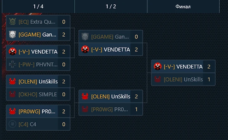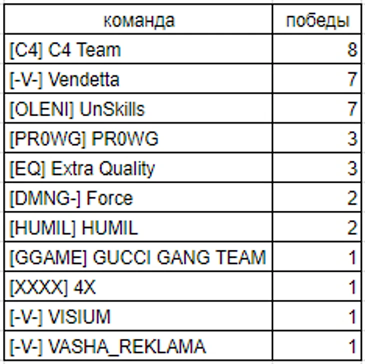 Больше всех группу выиграла команда C4. Стоит сказать, что первые победы у них начались только в конце января, до этого абсолютным лидерами были -V-, но затем они распались. Из других команд самую сильную игру показали: [PR0WG] PR0WG, [EQ] Extra Quality, [OLENI] UnSkills.