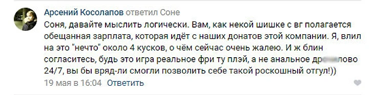 – WG я никогда не работала и не работаю. Не взяли. Серьезно, однажды я отправляла свое резюме на должность комьюнити-менеджера Blitz, работать меня не взяли. Но я была волонтером. А волонтерство – это не работа. Была модератором. С игроками общалась в чате игры и в группе VK, чистила комменты в группе, банила самых упоротых. Хотя я считаю, что я была добрым модером и банила не так часто. Меня никто не обязывал на смены приходить в чатик. Я могла спокойно в любой день сделать выходной. К сожалению, пришлось уйти, времени на канал катастрофически стало не хватать.